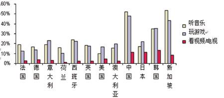 除打電話、發(fā)短信、拍照、手機郵箱以外,音樂、游戲也是用戶每周使用較多的業(yè)務(wù)。當(dāng)被問及其它應(yīng)用時,來自中國、新加坡還有韓國的部分被調(diào)查者表示,他們會經(jīng)常用手機來聽音樂和玩游戲。其中,中國是惟一一個選擇用手機聽音樂的用戶數(shù)與選擇用手機拍照的用戶數(shù)旗鼓相當(dāng)?shù)膰摇5腥さ氖,手機在中國不太可能成為MP3的替代品,仍然只是一個便攜播放器。在新加坡,手機替代MP3的可能性就大多了。Ovum認為,這是由于高端手機在新加坡市場占有很高的比例。在歐洲和美國,使用手機來聽音樂和玩游戲的比例則比亞洲少了很多,但值得鼓勵的是仍有超過10%的被調(diào)查者選擇了該答案。(見圖2)