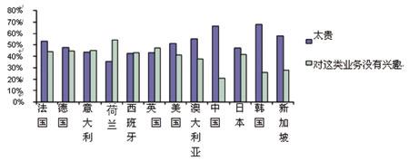 除了每周使用量之外,Ovum還向被調(diào)查者詢問是什么因素阻礙了他們通過手機應(yīng)用上述程序,被提及的最大顧慮是價格昂貴,其次是沒有興趣。在歐洲一些國家,對業(yè)務(wù)不感興趣是和費用昂貴同等重要的原因,在荷蘭,選擇對移動業(yè)務(wù)不感興趣的比例甚至超過了認為費用昂貴的比例。此外很有趣的是,沒有一個被調(diào)查者表示因為手機沒有這些功能而導(dǎo)致無法使用業(yè)務(wù)。(見圖4)