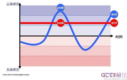 紅色情感曲線代表旨在提供全面理想體驗的傳統(tǒng)方法。藍(lán)色情感曲線反映的是一種資源分配的新方法,它專注于峰值和終了這兩個關(guān)鍵點同時將剩余子流程的表現(xiàn)控制在平均水平之下?此菩瘦^低的那個(藍(lán)色情感曲線)