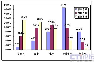 因?yàn)楦叨丝蛻粼诶麧?rùn)貢獻(xiàn)中所起的巨大作用,通過簡(jiǎn)單的計(jì)算即可得出,每一名鉆石卡客戶流失帶來的利潤(rùn)損失,相當(dāng)于9.4名銀卡客戶流失帶來的損失,或相當(dāng)于50名普通客戶流失帶來的損失,或相當(dāng)于125名新用戶流失帶來的直接損失。