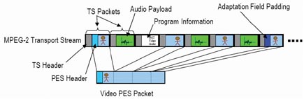 和VOD業(yè)務(wù)相關(guān)主要有3個協(xié)議,RTSP(Real Time Streaming Protocol)是一種會話控制協(xié)議,用于在IPTV網(wǎng)絡(luò)中傳送(如VOD業(yè)務(wù)的實(shí)時交互內(nèi)容),該協(xié)議基于TCP以保證可靠的控制信令傳送。RTP(Real Time Protocol)是一種無狀態(tài)的媒體流傳送協(xié)議,用于傳送多媒體內(nèi)容,該協(xié)議基于UDP或者TCP。MPEG TS(MPEG Transport Stream)包括多元的語音和視頻流封裝并承載在RTP/UDP或者直接在UDP上進(jìn)行視頻傳送。并且通過PID進(jìn)行語音和視頻的同步。TS流分為單節(jié)目的TS流(SPTS,Single Program TS)和多節(jié)目的TS流(MPTS,Multiple Program TS)兩種(見圖2)。通常情況下,一個UDP或者RTP/UDP數(shù)據(jù)包中,可以包括1~7個TS幀,一個TS幀長為188個字節(jié)。每個IP包里面包括整個或者部分視頻圖像信息。