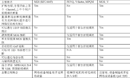 視頻流質(zhì)量是指視頻流在網(wǎng)絡(luò)中傳輸由于網(wǎng)絡(luò)的各種損傷對視頻流造成的影響,評定視頻流的質(zhì)量一般有兩種方法和指標(biāo):一種從網(wǎng)絡(luò)層進(jìn)行評定的MDI以及采用各種客觀指標(biāo)對視頻質(zhì)量主觀評定的MOS_V,另一種是視頻的全參考(Full Reference)質(zhì)量評定。幾種評定方面的簡單比較如表1所示,相應(yīng)指標(biāo)的介紹可以參考《電信網(wǎng)技術(shù)》2007年第12期的《IPTV QoE測試指標(biāo)概述》。