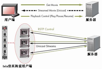 IXIA視頻測試方案可以很好地對VOD視頻服務(wù)器進(jìn)行支持,由于目前各個廠家對VOD業(yè)務(wù)所采用的RTSP控制協(xié)議進(jìn)行了不同程度和不同方式的修改和定制,要和VOD服務(wù)器進(jìn)行互通有一定的難度,IXIA根據(jù)這一特定的測試要求,可以對RTSP的流程進(jìn)行靈活定制和調(diào)整,支持RTSP各個命令信息交互的定制,支持的命令包括Describe,Setup,Play,Pause,Get Parameter,Set Parameter,Teardown等,這些靈活的特性可以保證IXIA能夠和業(yè)界幾乎所有的VOD服務(wù)器進(jìn)行互通并進(jìn)行性能測試。這是IXIA在視頻服務(wù)器測試方面非常重要的特性。目前,IXIA是Seachange公司視頻服務(wù)器認(rèn)證的測試工具(http://www.catr.cn/ctu/cshdt/200710/t20071031_646571.htm)?梢院蚑hompson,Bitband,Harmonic,Darwin以及Windows Media Server等業(yè)界常見的視頻服務(wù)器互通并提供性能測試。圖3是VOD服務(wù)器交換過程與IXIA進(jìn)行性能測試示意。