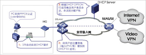 當(dāng)網(wǎng)絡(luò)設(shè)備收到STB的DHCP請(qǐng)求報(bào)文時(shí),需要在報(bào)文后添加OPTION82字段,此時(shí)有兩種模式進(jìn)行DHCP+認(rèn)證,一種是直接把DHCP報(bào)文送給DHCP服務(wù)器,由DHCP服務(wù)器根據(jù)OPT82字段來(lái)判斷該用戶是否為合法用戶,從而決定是否為其分配IP地址。另一種是DHCP報(bào)文先送到BRAS,由BRAS將OPT82字段放到RADIUS的一個(gè)子域里,通過(guò)RADIUS服務(wù)器來(lái)進(jìn)行用戶合法性認(rèn)證,若用戶合法,再由DHCP服務(wù)器分配IP地址。