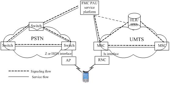 在FMC-PAU中,移動(dòng)終端屬于雙;蚨嗄=K端,用戶(hù)使用該終端既可以接入到3G移動(dòng)網(wǎng),也可以采用無(wú)線(xiàn)方式通過(guò)接入節(jié)點(diǎn)(AP)接入到PSTN網(wǎng)絡(luò)中。