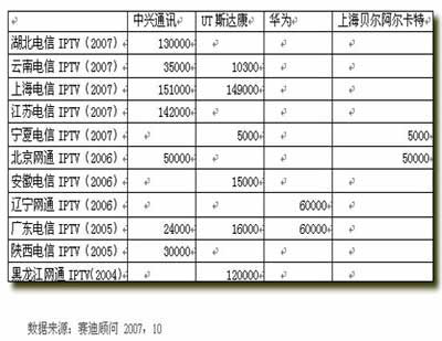 根據(jù)賽迪顧問統(tǒng)計,至2007年第三季度為止,國內(nèi)的IPTV用戶數(shù)達到了101.2萬。在國內(nèi)的IPTV設備供應商中,主要有中興通訊,UT斯達康,華為及上海貝爾阿爾卡特。