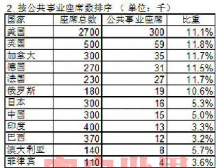美國擁有全世界最多的座席,達(dá)到270萬個(gè),公共事業(yè)座席30萬個(gè),占11.1%;除美國以外,公共事業(yè)類座席總數(shù)排名在第2~6名的依次是:英國,加拿大,德國,法國,俄羅斯。