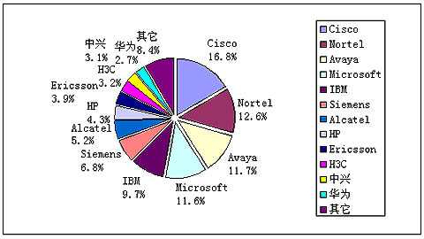 賽迪顧問預測,2009年中國統(tǒng)一通信市場中,在通信設備領域,Cisco市場份額將達到16.8%,繼續(xù)保持領頭樣的位置,而且市場份額有望繼續(xù)增加,Nortel和Avaya緊隨其后,市場份額分別將達到12.6%和11.7%。而在軟件廠商方面,Microsoft和IBM將繼續(xù)保持市場領先地位,市場份額分別將達到11.6%和9.7%,增長勢頭強勁。其它市場份額較大的國外統(tǒng)一通信廠商還有西門子、阿爾卡特、愛立信、HP等。在國內(nèi)方面,中興和H3C分別以約3%的市場份額占據(jù)領先位置。