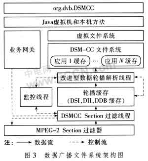 中間件的數(shù)據(jù)廣播文件系統(tǒng)主要負責(zé)裝載廣播應(yīng)用,是數(shù)據(jù)輪播協(xié)議在終端實現(xiàn)的核心模塊。圖3給出了基于改進型數(shù)據(jù)輪播方案的數(shù)據(jù)廣播文件系統(tǒng)的架構(gòu)圖。相關(guān)Java功能在org.dvb.DSMCC包實現(xiàn),對應(yīng)中間件架構(gòu)的系統(tǒng)層部分。具體的功能實現(xiàn)位于核心層。