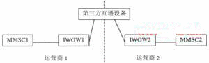 為實(shí)現(xiàn)不同運(yùn)營(yíng)商的用戶之間相互發(fā)送和接收多媒體消息,需要在不同運(yùn)營(yíng)商的多媒體消息中心之間實(shí)現(xiàn)互通。該互通需要多媒體消息中心(MMSC)與互通設(shè)備(IWGW)的連接、IWGW之間的連接實(shí)現(xiàn)。當(dāng)一個(gè)運(yùn)營(yíng)商的網(wǎng)絡(luò)用戶向另一個(gè)運(yùn)營(yíng)商的網(wǎng)絡(luò)用戶發(fā)送多媒體消息時(shí),該多媒體消息經(jīng)發(fā)送方用戶歸屬的MMSC通過IWGW提交給接收方用戶歸屬的多媒體消息中心,由接收方用戶歸屬的MMSC向其網(wǎng)內(nèi)用戶發(fā)送。網(wǎng)間多媒體消息業(yè)務(wù)互通網(wǎng)絡(luò)結(jié)構(gòu)中主要包括多媒體消息中心(MMSC),互通設(shè)備(IWGW)以及相關(guān)的輔助設(shè)備等。IWGW是指不同運(yùn)營(yíng)商網(wǎng)絡(luò)之間的多媒體消息互通設(shè)備。網(wǎng)間多媒體消息互通設(shè)備間的互聯(lián)可以由兩個(gè)運(yùn)營(yíng)商的IWGW直接連接,也可以經(jīng)過第三方互通設(shè)備轉(zhuǎn)接(見圖1、圖2)。