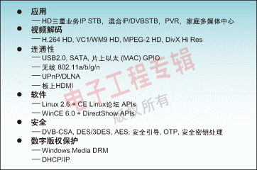 這確保了在HD屏幕上顯示SD內(nèi)容的圖像質(zhì)量。此外,NXP的開發(fā)平臺(tái)支持圖2所示的所有技術(shù)和應(yīng)用。NXP提供兩個(gè)專用平臺(tái):用于MPEG-2-HD、SD H.264、WM9、AVS的STB810平臺(tái)和用于HD H.264 a和VC1的STB225平臺(tái)。IP-STB平臺(tái)應(yīng)該提供一個(gè)驗(yàn)證核技術(shù),例如NXP公司基于Nexperia技術(shù)的平臺(tái),并且每一個(gè)研發(fā)工具都向后兼容。