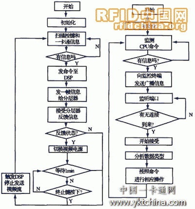對(duì)于底層軟件,主要是門口終端的控制軟件,其工作流程如圖5所示。門口終端上電后,先進(jìn)行初始化工作,然后開始掃描按鍵和一卡通信息,當(dāng)確認(rèn)有變化時(shí),微處理器CPU l先給分層器發(fā)送一幀信息,并且監(jiān)聽分層器的反饋信息,同時(shí)啟動(dòng)DSP通過網(wǎng)絡(luò)端口發(fā)送廣播消息給監(jiān)控終端,以便啟動(dòng)監(jiān)控終端的接受線程接受視頻流和訪問信息或一卡通信息。當(dāng)時(shí)間超過l min或終止鍵按下時(shí),雙方終止通信,門口終端與監(jiān)控終端之間由CPU1觸發(fā)DSP中斷,使其停止發(fā)送視頻流數(shù)據(jù)。