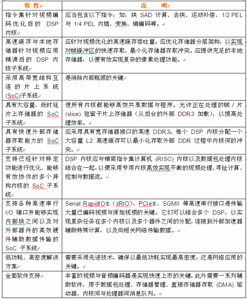 媒體格式豐富的應(yīng)用要求能夠跨越多個通道的高密度DSP功能,值得慶幸的是,滿足該種應(yīng)用需求的多核多媒體處理器已經(jīng)問世。在為新一代媒體應(yīng)用挑選多核媒體處理器時應(yīng)當(dāng)考慮一系列重要特性。表 1 列出了這些特性及相關(guān)重要說明。