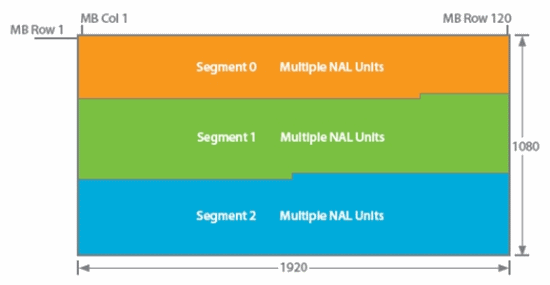 在這種架構(gòu)中,編碼器的實(shí)施分配到多個 DSP 內(nèi)核。每個宏塊條都分配到一個DSP內(nèi)核。其中每個內(nèi)核都提供一些特定功能,如:速率控制與幀內(nèi)圖像處理。事實(shí)上,無法預(yù)先進(jìn)行比特預(yù)算并分配到各個宏塊條,因?yàn)椴煌陦K條可能具有不同的圖像復(fù)雜性,而在圖像分割塊之間采用差異很大的Qp值會造成合成圖像的層邊界出現(xiàn)偽影。在H.264中,宏塊條NAL可以包含任意數(shù)量的宏塊,因此與H.263不同,圖像分割塊的形狀無需符合GOB邊界。每個宏塊條的頭部(slice header)均包含宏塊條數(shù)據(jù)中編碼的第一個宏塊的編號。
