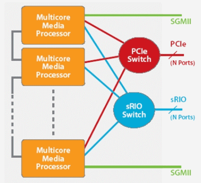 圖3說明,高速串行I/O在復(fù)雜視頻處理任務(wù)中的潛在應(yīng)用。圖中顯示用于擴(kuò)展多個器件中多核器件處理能力的連接方案,其可以實(shí)現(xiàn)更復(fù)雜的視頻處理運(yùn)算或支持更多視頻轉(zhuǎn)碼通道。采用sRIO開關(guān)能夠?qū)崿F(xiàn)更靈活的器件間通信,不過如果處理流處于相鄰器件之間,也可以不采用這種開關(guān)。與PCIe開關(guān)相比,sRIO由于其數(shù)據(jù)包開銷較低,因此一般成本更低、性能更高、且時延更短。