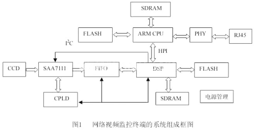 為實(shí)現(xiàn)視頻實(shí)時(shí)檢測(cè)以及網(wǎng)絡(luò)傳輸功能,本監(jiān)控終端采用ARM+DSP的體系框架,系統(tǒng)組成如圖1所示,主要包括以ARM S3C4510B為核心的主控兼網(wǎng)絡(luò)傳輸模塊,以SAA7111為核心的視頻采集模塊,以DSP TMS320C6202為核心的視頻檢測(cè)模塊,以CPLD EPM7128為核心的控制模塊,以及電源管理模塊等。系統(tǒng)具備視頻采集、視頻檢測(cè)、圖像數(shù)據(jù)的打包、網(wǎng)絡(luò)傳輸、控制等功能。其工作流程是:主控CPU S3C4510B上電初始化,SAA7111初始化,S3C4510B系統(tǒng)自檢、裝載TMS320C6202程序至RAM、啟動(dòng)DSP,設(shè)定SAA7111初始參數(shù),攝像機(jī)的模擬信號(hào)經(jīng)過數(shù)據(jù)采集、緩存后,DSP及其外圍電路對(duì)其進(jìn)行運(yùn)動(dòng)目標(biāo)檢測(cè),將檢測(cè)結(jié)果通過DSP的HPI接口傳遞給S3C4510B,S3C4510B對(duì)數(shù)據(jù)打包,建立套接字通訊服務(wù)器,等待連接進(jìn)行網(wǎng)絡(luò)發(fā)送。