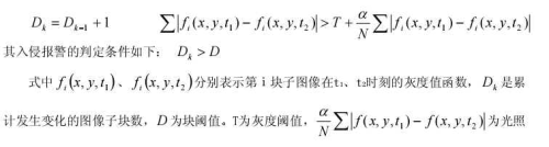 本設(shè)計(jì)中采集的是灰度圖像,為了實(shí)現(xiàn)入侵掃描功能,要求能夠存儲(chǔ)兩場(chǎng)圖像?紤]到檢測(cè)實(shí)時(shí)性要求,采用基于幀間差分的變化檢測(cè)。檢測(cè)運(yùn)動(dòng)目標(biāo)時(shí),考慮到對(duì)目標(biāo)大小的選擇性以及為了克服光照變化引起的虛警報(bào), 在幀間差分基礎(chǔ)上,引入圖像塊概念,將圖像分成M個(gè)n×n的子塊,判斷每一子塊圖像是否發(fā)生變化,統(tǒng)計(jì)發(fā)生變化的子塊數(shù)目,判斷式為: