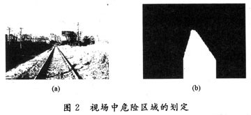 圖像二值化后的結(jié)果如圖2(a)所示,得到的最終結(jié)果如圖2(b)所示。從兩幅圖像的對比可以看出,圖像經(jīng)過一系列處理后,基本標(biāo)定了危險區(qū)域。對于得到的圖2(b),圖中白色的區(qū)域為鐵道雙軌內(nèi)部即設(shè)定的危險區(qū)域。應(yīng)用此種方法得到的結(jié)果圖像在光照條件充足情況下能夠得到更好的效果,不適用于光照條件不足和夜間的危險區(qū)域標(biāo)定。