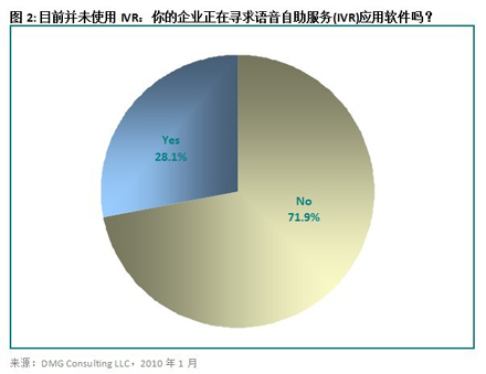 28.1%目前還沒有使用IVR系統(tǒng)的公司正在積極尋求語音自助服務(wù)解決方案來幫助自己達(dá)成目標(biāo),這一數(shù)字高得頗讓人驚訝。見圖2。經(jīng)濟(jì)衰退促使那些曾經(jīng)對使用自助服務(wù)技術(shù)猶豫不決的企業(yè)下定決心投資購買此類解決方案。一個(gè)具有正確規(guī)劃、設(shè)計(jì)和投放過程的IVR系統(tǒng)能夠?qū)⑷斯ご硖幚淼碾娫捔拷档?0%到90% (長期來說),具體數(shù)字有賴于聯(lián)絡(luò)中心的目的以及編入解決方案內(nèi)部的任務(wù)。IVR用戶的增長勢頭有望在經(jīng)濟(jì)形勢好轉(zhuǎn)之后仍然延續(xù)下去。一個(gè)經(jīng)過良好設(shè)計(jì)并成功實(shí)施的IVR方案所帶來的利益和節(jié)約的成本是即便最不情愿使用它的經(jīng)理都不得不承認(rèn)的。