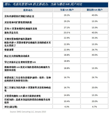 圖3顯示了現(xiàn)有和潛在的語音自助服務(wù)用戶尋求托管型IVR的主要動力來源。潛在客戶認(rèn)真考慮托管型IVR解決方案的兩個(gè)很明顯的原因是避免大的資金開銷和最小化啟動成本,在經(jīng)濟(jì)不景氣時(shí)這樣的做法并不令人意外。另外還有個(gè)原因是希望一邊使用該方案一邊積累經(jīng)驗(yàn)和知識。