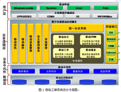 移動工單系統(tǒng)是在Windows Mobile智能手機操作系統(tǒng)上自主研發(fā),采用B/S和C/S混合架構(gòu),以TCP/IP作為基礎(chǔ)數(shù)據(jù)傳輸協(xié)議,通過移動通信網(wǎng)絡(luò)無線數(shù)據(jù)通道GPRS/EDGE/CDMA1x等,將呼叫中心的工單數(shù)據(jù)推送到智能手機上,由外勤服務(wù)人員將服務(wù)情況進(jìn)行實時的反饋。利用的同步中間件可將最新的資訊文件推送到手機終端上,服務(wù)人員無需登錄即可在終端可以查看最新的廣電資訊,可支持doc、xls、ppt等 Office文檔格式的瀏覽,支持WMV、WAV、3GP多種音視頻文件播放。服務(wù)人員可以不受地點和時間的限制通過終端實時獲取最新的多媒體客戶交互中心運營數(shù)據(jù)報表,圖2為系統(tǒng)設(shè)計方案圖。