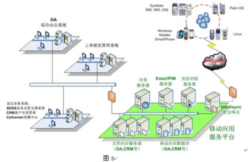 用戶通過智能手持終端訪問應(yīng)用,平臺支持采用Symbian、SmartPhone、PocketPC和Palm操作系統(tǒng)的終端,還支持SyncML、brew、java、Windows PC的應(yīng)用。