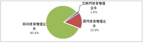按網(wǎng)絡(luò)接入方式分類,語音增值業(yè)務(wù)可以分為固網(wǎng)語音增值業(yè)務(wù)、移動語音增值業(yè)務(wù)和互聯(lián)網(wǎng)語音增值業(yè)務(wù)三種。市場占有比例分別是:固網(wǎng)語音增值業(yè)務(wù)占15%,移動語音增值業(yè)務(wù)占83.4%,互聯(lián)網(wǎng)語音增值業(yè)務(wù)占1.6%。如下圖所示: