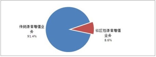 目前,新業(yè)務(wù)模式仍在探索階段,市場仍以傳統(tǒng)語音增值業(yè)務(wù)為主。在中國語音增值業(yè)務(wù)市場中,傳統(tǒng)語音增值業(yè)務(wù)占91.4%,其中主要份額來自移動通信網(wǎng);社區(qū)性語音增值業(yè)務(wù)占8.6%,其中主要份額來自固網(wǎng)。如下圖所示: