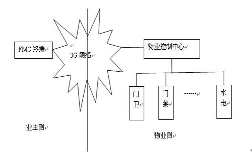如何實(shí)現(xiàn)由業(yè)主決定是否讓來訪者進(jìn)入小區(qū)呢?利用FMC技術(shù)實(shí)現(xiàn)小區(qū)的物業(yè)管理(為了敘述方面,簡稱為FMC小區(qū)),就能容易解決。下圖為FMC小區(qū)的拓?fù)浣Y(jié)構(gòu)圖。