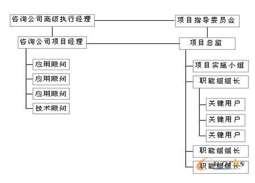 這支隊伍既有企業(yè)高級管理層所組成的指導(dǎo)委員會和咨詢公司人員,也有來自信息部門的技術(shù)人員和相應(yīng)職能部門的熟悉企業(yè)流程的業(yè)務(wù)人員所組成的實施小組和職能小組。項目隊伍組織結(jié)構(gòu)如圖所示