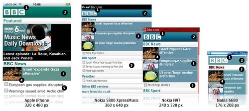 BBC還可以為特定的設(shè)備(或是一組設(shè)備)重新編排一些內(nèi)容。iPhone有非常豐富的功能,因此iPhone版的BBC還有音樂下載選項,而其他的設(shè)備可能只會顯示今天最熱門的‘BBC新聞’?梢愿鶕(jù)數(shù)據(jù)的大小,多媒體的處理能力甚至是屏幕的尺寸決定是否需要針對iPhone提供更加豐富的內(nèi)容。以Nokia 6680上的‘特色’顯示為例,它大部分的顯示內(nèi)容是讓用戶滾動屏幕查看今天最熱門新聞故事。iPhone上顯示了三個新聞故事,而其中只有一篇配有插入。這使得用戶無需滾動屏幕就可以大致了解全部的咨詢。