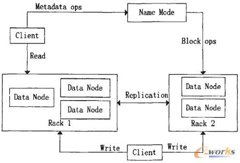 在云端,本系統(tǒng)采用開源框架Hadoop 0.20.2來實(shí)現(xiàn)。該框架主要提供Hadoop分布式文件系統(tǒng)(HDFS)和Map Reduce。其中HDFS為分布式計算存儲提供了底層支持,圖2是HDFS的結(jié)構(gòu)示意圖: