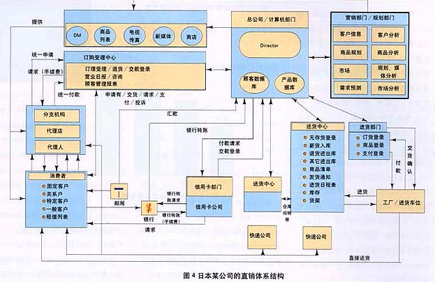 ——圖4示意了日本某家大型通信公司的體系結(jié)構(gòu)。一般來說,直銷體系由以下幾大環(huán)節(jié)構(gòu)成: