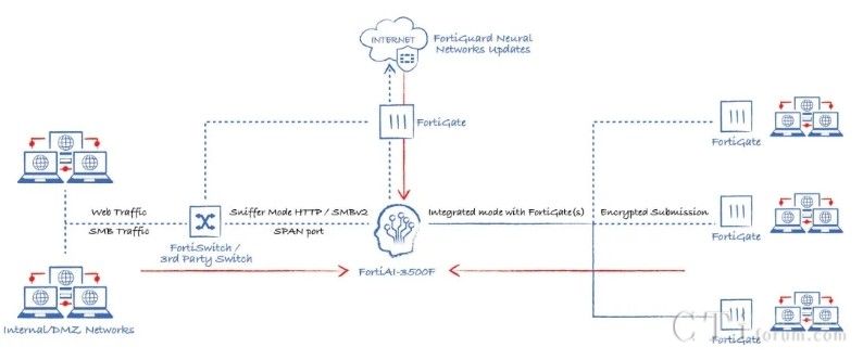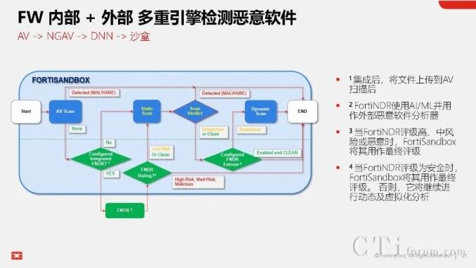 此外,AI技術(shù)還貫穿于Fortinet的多個(gè)產(chǎn)品與功能中,形成高效的工作流。以威脅檢測(cè)與響應(yīng)為例,當(dāng)FortiGate的雙引擎也無法確定某個(gè)文件的合法性時(shí),它可以將該文件提交給FortiNDR進(jìn)行深度分析,利用云端深度神經(jīng)網(wǎng)絡(luò)AI進(jìn)行0 Day攻擊、勒索軟件等深層次分析。若仍無法確定,還可進(jìn)一步提交給FortiSandbox,在虛擬機(jī)環(huán)境中進(jìn)行模擬操作,進(jìn)行更為深入的檢測(cè)。在這一系列流程與技術(shù)的支持下,F(xiàn)ortinet的威脅檢測(cè)與響應(yīng)能力已達(dá)到業(yè)界頂尖水平,向滿分100分邁進(jìn)。