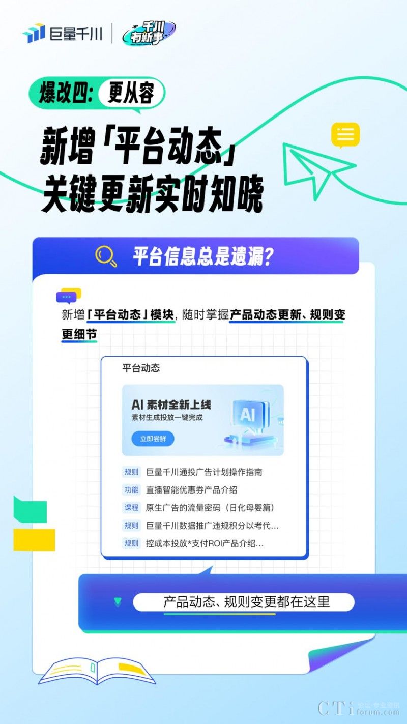 巨量千川首頁(yè)升級(jí)還增設(shè)了「平臺(tái)動(dòng)態(tài)」模塊,實(shí)時(shí)呈現(xiàn)平臺(tái)產(chǎn)品更新、規(guī)則變更等信息,讓商家可以及時(shí)了解平臺(tái)最新動(dòng)態(tài),把握生意增長(zhǎng)機(jī)遇。