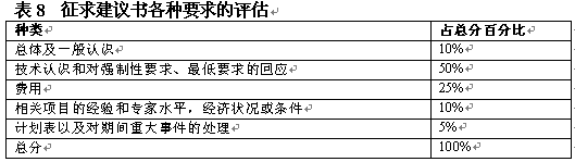 。。在決定了初步要求之后,評(píng)估小組應(yīng)具體地開(kāi)展評(píng)估工作。具體評(píng)估的目標(biāo)是通過(guò)給建議書(shū)主要方面打分作出評(píng)估?梢栽谒愠鼋ㄗh書(shū)各方面占總分?jǐn)?shù)的百分比,如表8中對(duì)各方面的總覽。一般在建議書(shū)內(nèi)向提供者給出這一信息。