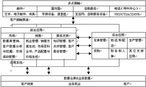 從源頭上把握最便捷的方法就是了解概念,即什么是CRM。世界著名IT系統(tǒng)項(xiàng)目論證與決策權(quán)威機(jī)構(gòu)—Gartner Group(注:Gartner Group在全球率先提出了CRM的概念)認(rèn)為CRM是迄今為止規(guī)模最大的IT概念,但CRM并非等同于單純的信息技術(shù)或管理技術(shù)。它是一種企業(yè)商務(wù)戰(zhàn)略,目的是使企業(yè)根據(jù)客戶分段進(jìn)行重組,強(qiáng)化使客戶滿意的行為并聯(lián)接客戶與供應(yīng)商之間的過程,從而優(yōu)化企業(yè)的可盈利性,提高利潤并改善客戶的滿意程度。具體操作時,它將看待“客戶”的視角從獨(dú)立分散的各個部門提升到了企業(yè)層次,各個部門負(fù)責(zé)與客戶的具體交互,但向客戶負(fù)責(zé)的卻是整個企業(yè)。以一個面孔面對客戶,是成功實(shí)施CRM的根本。為了實(shí)現(xiàn)CRM,企業(yè)與客戶連接的每一環(huán)節(jié)都應(yīng)實(shí)現(xiàn)自動化管理。那么企業(yè)與客戶連接的環(huán)節(jié)究竟包括些什么內(nèi)容,Gartner Group進(jìn)一步提出了周而復(fù)始的五領(lǐng)域概念:戰(zhàn)略、戰(zhàn)術(shù)、業(yè)務(wù)過程、技能和技術(shù)。戰(zhàn)略集中體現(xiàn)了企業(yè)的經(jīng)營目標(biāo)和理念,還往往滲透于企業(yè)的文化。如CRM強(qiáng)調(diào)以客戶為中心對企業(yè)來說就是一種戰(zhàn)略性選擇;戰(zhàn)術(shù)是戰(zhàn)略的承載體,構(gòu)成戰(zhàn)略的日常要素必須體現(xiàn)和服務(wù)于企業(yè)的整體戰(zhàn)略。如以客戶為中心企業(yè)組織結(jié)構(gòu)的重組就是企業(yè)戰(zhàn)略在戰(zhàn)術(shù)環(huán)節(jié)的反映;CRM的業(yè)務(wù)過程包括銷售管理、市場管理、分析管理、交貨與后臺處理自動化(如ERP)和服務(wù)管理幾個方面,即Gartner所宣稱的營銷自動化的概念。在此需要強(qiáng)調(diào)的是CRM的業(yè)務(wù)過程的重組也必須體現(xiàn)企業(yè)理念重組和組織重組的價值取向;后兩項(xiàng)技能和技術(shù)則構(gòu)成了實(shí)現(xiàn)前三者的堅強(qiáng)支撐,是各環(huán)節(jié)實(shí)現(xiàn)自動化管理的可靠保證和重要組成部分。