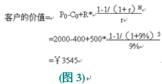 假設(shè)客戶與公司保持交易時間:N=5年;公司最初吸引每個客戶的成本(營銷費用): C0=¥400;客戶第一次購買的產(chǎn)品價格:P0=¥2000;公司期望每年從每個客戶處增加的收入:R=¥500;利率(一般指貸款利率): r =9%;那么客戶的價值等于:客戶初次購買產(chǎn)品和以后幾年每年消費價值的折現(xiàn)之和,減營銷成本,即:
