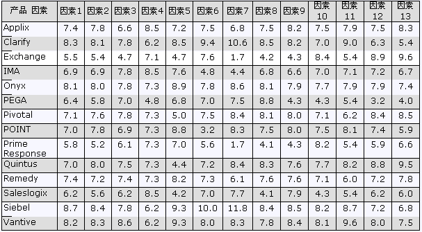 下表摘自Gartner Group 2000年六月份對(duì)14種CRM廠商和產(chǎn)品的比較。原來的報(bào)告以柱狀圖的形式進(jìn)行比較,為了縮短篇幅,我們轉(zhuǎn)化為表格形式借以引用。