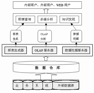 三個層次簡單明了,但在實(shí)際實(shí)施時,卻需要應(yīng)用數(shù)據(jù)挖掘、人工智能、機(jī)器學(xué)習(xí)等多個領(lǐng)域的理論和技術(shù),以及統(tǒng)計學(xué)、決策科學(xué)、計算機(jī)科學(xué)等方面專業(yè)人才的密切合作,才能從數(shù)據(jù)倉庫的海量數(shù)據(jù)中淘出所需要的“金”;跀(shù)據(jù)倉庫的CRM體系結(jié)構(gòu)如圖所示。