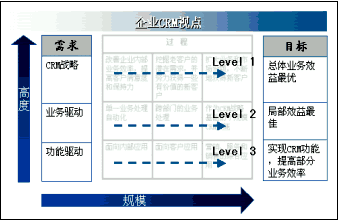 從全球CRM最佳實(shí)踐來看,企業(yè)實(shí)施CRM不外乎CRM軟件功能驅(qū)動、業(yè)務(wù)驅(qū)動和客戶關(guān)系戰(zhàn)略驅(qū)動三種情況。所以,實(shí)施CRM的視點(diǎn)也有三種,如下圖所示:一是,從CRM產(chǎn)品功能角度,根據(jù)產(chǎn)品所能提供的功能,選擇自己需要實(shí)施的CRM內(nèi)容。這種視點(diǎn)充其量只能夠讓企業(yè)擁有部分CRM的功能,有限地提高部分業(yè)務(wù)處理的效率。二是,從業(yè)務(wù)角度出發(fā),通過局部優(yōu)化業(yè)務(wù)流程,實(shí)施CRM。在項(xiàng)目中所涉及的業(yè)務(wù)流程可能要貫穿多個(gè)CRM功能模塊。這種視點(diǎn)解決了一部分業(yè)務(wù)問題,它主要以流程效益或部門效益最優(yōu)為目標(biāo)。三是,從企業(yè)CRM戰(zhàn)略角度出發(fā),從總體、全局、發(fā)展的高度規(guī)劃和實(shí)施CRM。CRM戰(zhàn)略驅(qū)動視點(diǎn)不僅追求局部效益最優(yōu),而且能夠?qū)崿F(xiàn)企業(yè)總體業(yè)務(wù)效益的最大化。雖然,企業(yè)可以根據(jù)自身客戶關(guān)系管理的實(shí)際情況選擇CRM視點(diǎn)的高度,但是在絕大多數(shù)企業(yè)的實(shí)踐中,都會選擇CRM戰(zhàn)略高度作為著眼點(diǎn),規(guī)劃企業(yè)客戶關(guān)系管理。