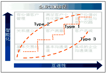 眾所周知,人們外出旅行都需要事先設(shè)計(jì)旅行路線,以保證在規(guī)定的時(shí)間內(nèi)取得最佳旅行效果并使成本最合理。實(shí)施CRM也不例外。企業(yè)CRM途徑是企業(yè)實(shí)施CRM的路線圖,也是CRM規(guī)劃的內(nèi)容之一。它通常有三種實(shí)施途徑,Type 1是"小步快跑"型,Type 2是"改革優(yōu)先"型,Type 3是"技術(shù)驅(qū)動"型,如下圖所示。圖中互連性,表示企業(yè)信息化環(huán)境建設(shè)的規(guī)模,也意味著企業(yè)與客戶的交互程度,即溝通能力;縱坐標(biāo)所示的智能化,代表管理思想、管理模式、知識應(yīng)用和情感投入,是客戶關(guān)系管理中人性化和價(jià)值衡量的雙重體現(xiàn)。
