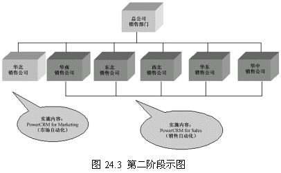 這一階段首先確立一個點(華北銷售公司),這個點的選擇要考慮多方面的因素,比如員工素質(zhì)、電腦應用水平以及基礎(chǔ)設(shè)施等。第一階段目標的實現(xiàn)對整個項目關(guān)系重大,是一個示范性的實施,對維持管理層和員工對CRM項目的信心具有重要的意義。