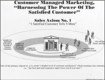 客戶滿意的影響范圍如下圖所示,客戶滿意的力量從里向外逐層波及,以現有客戶的滿意為基礎,然后通過推薦傳遞到新的客戶。其傳遞路徑為“現有客戶”——“現有客戶的家人及朋友”——“現有客戶的家人及朋友的家人及朋友”…一直延伸下去最終使企業(yè)的營銷策略大獲成功,這一切的動力都來自于“更高的客戶滿意度引起的客戶行為”。這個營銷公式要取得長期成功沒有任何秘密,它失敗的風險被最小化,因為它依靠的是客戶積極的行動和表現,以久經考驗的銷售公理——“1個滿意的客戶會把自己的愉快經歷告訴5個以上的人!薄獮榛A。