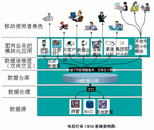 電信行業(yè)早期的CRM系統(tǒng)主要是由單一的多維分析子系統(tǒng)組成,比如移動總公司最早的CRM系統(tǒng)就僅僅規(guī)范了以多維分析為標(biāo)準(zhǔn)的九大主題分析。隨著移動電信市場的迅速增長,復(fù)雜程度越來越高,更多的子系統(tǒng)被添加進(jìn)來,IT系統(tǒng)建設(shè)中模塊化的思路通過數(shù)據(jù)集市的方式在CRM建設(shè)中體現(xiàn)明顯。