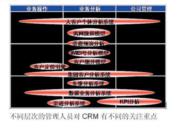CRM系統(tǒng)有別于電信行業(yè)其他IT系統(tǒng)的最大特點(diǎn)是建設(shè)重心后移。BOSS、網(wǎng)絡(luò)管理平臺等作為運(yùn)營商的主要生產(chǎn)系統(tǒng),其建設(shè)重點(diǎn)在其基礎(chǔ)建設(shè)時(shí)期。這些系統(tǒng)的基礎(chǔ)建設(shè)完成上線使用后,作為生產(chǎn)系統(tǒng),其工作重點(diǎn)轉(zhuǎn)變?yōu)橄到y(tǒng)優(yōu)化調(diào)整以及新功能模塊的開發(fā)工作,整個系統(tǒng)的使用可以全面鋪開。但是CRM系統(tǒng)的建設(shè)過程往往會從需求調(diào)研、功能架構(gòu)設(shè)計(jì)、基礎(chǔ)建設(shè)一直延伸到了應(yīng)用實(shí)施。只有系統(tǒng)應(yīng)用好了,出效益了,才能推動整個CRM系統(tǒng)的向前演進(jìn)。
