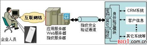 基于生物識別技術(shù)的CRM指紋身份認(rèn)證系統(tǒng)應(yīng)用模式如下: