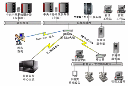 按銀行級(jí)標(biāo)準(zhǔn)建立會(huì)員卡及儲(chǔ)值卡系統(tǒng),系統(tǒng)集中部署在總部,可以授權(quán)各門店或代理點(diǎn)發(fā)行;我們建議在主機(jī)房隔壁的大樓或其他有安全距離的地點(diǎn)建立容災(zāi)備份機(jī)房,兩個(gè)機(jī)房之間用光纖連接,采用雙機(jī)熱備軟件。