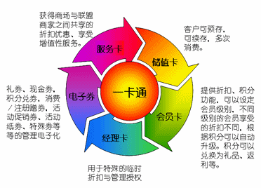 中央卡券系統(tǒng)在一張卡上集成了八種通用的、經(jīng)市場(chǎng)營(yíng)銷實(shí)踐考驗(yàn)成熟的營(yíng)銷功能群,每一種營(yíng)銷功能群相當(dāng)于目前在商場(chǎng)中應(yīng)用的一張“卡”:儲(chǔ)值卡、積分卡、禮品卡、折扣卡、市場(chǎng)活動(dòng)卡、服務(wù)卡、電子券、管理者特殊折扣授權(quán)卡。