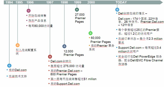 在1997年,Dell開始提供一項稱為“我的Dell”的服務(wù)項目。任何顧客都可以在Dell網(wǎng)站上建立一個屬于自己的定制化網(wǎng)頁。顧客可以選擇希望出現(xiàn)在這個頁面上的個人化信息。對于公司的投資者(或者大的客戶),如果希望獲得公司最新宣布的產(chǎn)品的相關(guān)信息以及市場擴(kuò)展情況,可以選擇在自己的“我的Dell”網(wǎng)頁上觀看最新發(fā)布的消息和投資信息。Dell提供全面定制化并有密碼保護(hù)的網(wǎng)上站點(diǎn)——Premier Page,通過使用該站點(diǎn)提供的程序,客戶可以將Dell網(wǎng)站的一部分引入客戶自己的企業(yè)網(wǎng),使客戶獲得一連串的消費(fèi)服務(wù)。到了Dell 2006財政年度的結(jié)束時,公司在世界各地已經(jīng)建立了超過十萬個Premier Page互聯(lián)網(wǎng)站點(diǎn)。 Premier Page的發(fā)展歷程如下: